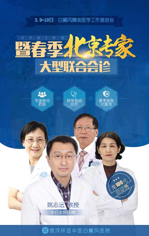 为了帮助广大的患者解决白斑问题,降低春季白斑的复发率,同时也是贯彻卫生部关于推进“精准医学”的号召,武汉环亚医院将于3月9日-3月10日举行“白癜风精准医学工作推进会暨春季北京医生大型联合会诊”活动。